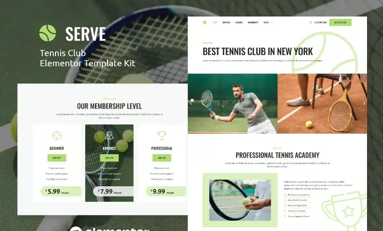 Serve is a professional Elementor Template Kit for Tennis School & Sport Club website. It has simple and clean design with modern layout style. Designed to use with Elementor , ready to import and reusable for Tennis Club website. It works with most themes and is optimized for use with the free Hello Elementor theme.